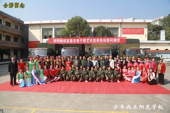11月6日上午,宜昌市老干部艺术团一行40余人,来到我校慰问演出,为我校全体师生奉献了一台精彩的文艺大餐。陈锋校长代表学校发表致辞,对市老干部艺术团的到来表示热烈的欢迎和衷心的感谢。在此次文艺演出中,市老干部艺术团表演了舞蹈、独唱、快板、诗朗诵等10多个文艺节目,其中舞蹈《最美的歌儿唱给妈妈》、歌舞表演《三峡•我的家乡》、群口快板《美丽宜昌我的家》等节目充满激情,催人奋进,表达了老同志们热爱祖国、热爱家乡、热爱生活的情怀。特别是他们还专门针对我校的教育特色,编排了舞蹈《我为教员洗衣裳》和诗朗诵《母亲的泪》,使学生们在观看演出中受到了一次深刻的教育。我校学生也表演了背诵《弟子规》、军体拳、太极拳等节目,向艺术团的同志们展示了我校学生们良好的精神风貌。市老干部艺术团的同志们虽然从各条战线不同岗位退下来了,但他们仍以关心青少年的健康成长为己任,不辞劳苦,以寓教于乐的方式,为培育祖国下一代继续发挥余热。演出结束后,参演的各位爷爷奶奶纷纷与学生们合影留念,并在学校食堂和同学们共进午餐!